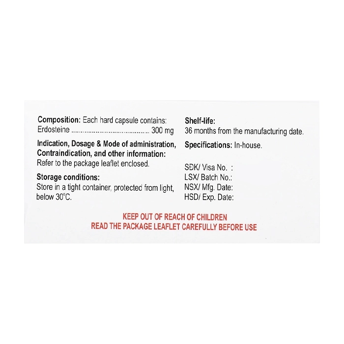 - Homoeystin niệu (hoạt chất chuyên hóa một phần thành homoeystein. hiện không có tài liệu nào liên quan đến việc sử dụng erdostein cho bệnh nhân có các bất thường chuyên hóa các amino acid. đặc biệt là các bệnh nhân có chế độ ăn kiêng không có methionin).